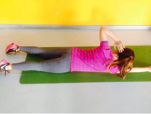 2、单手支撑肘关节微弯曲,另一手轻微抱头