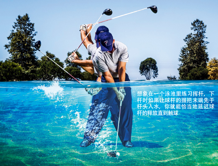 为了获得保持能量角的感觉,想象你正在一个齐腰深的游泳池里挥杆。当你从这个假想挥杆的上杆顶点开始下挥时,试着让球杆的握把末端先于杆头入水。如果你无法想象这个动作,可以回到挥杆顶点,仅用双臂将握把末端朝水中上下抽送。做两次,在第三次下压时完成挥杆,并确保在移动任何部位之前先转动髋部。