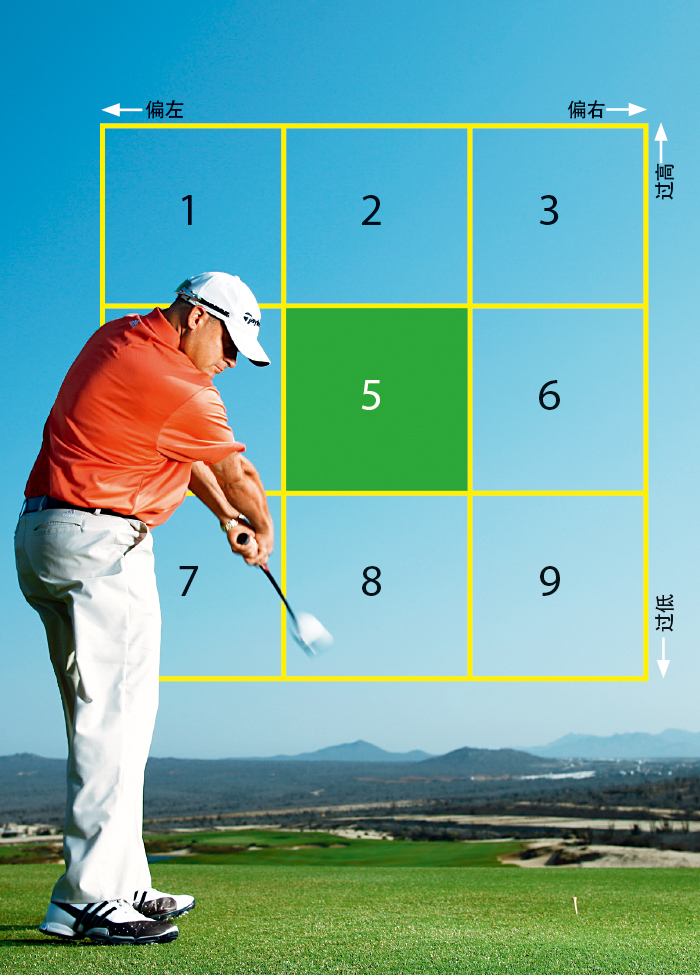 如上图所示,在练习场站位,想象前方的空中飘着一个大正方形,其中包括9个带有数字的小方格。面对这个大正方形,使用1号木杆打10个球。认真统计一下每个方格分别有几个球通过。