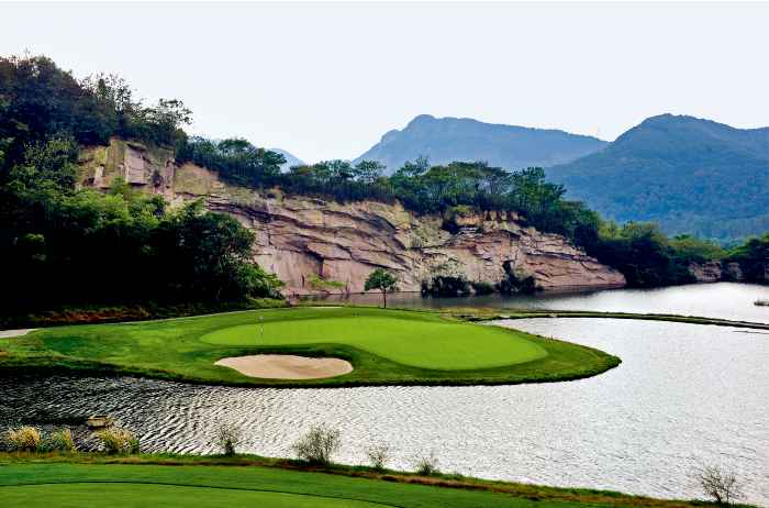 全长203码的6号洞被很多会员称为“卧虎藏龙洞”,作为球场中最难的3杆洞,难度系数自不必说,能称龙称虎,最关键还是它的景色,果岭旁边的竹林最为醒目。贺飞坦言,竹林真是老天所赐,一般来说,果岭最怕竹子,如果下面生根就会把果岭毁掉,但6号洞旁边的竹林下面有条山溪,球会就顺着这条山溪建了球道。如此一来,果岭既没有被竹子破坏,又借了竹子的景色。这个作为全场唯一的上坡短洞,景色虽令人陶醉,但果岭也足够恐怖。很多人为了避开果岭左侧的小溪而将球放到果岭右侧,宋亮亮与贺飞两位高手在果岭上无一例外都出现了三推。