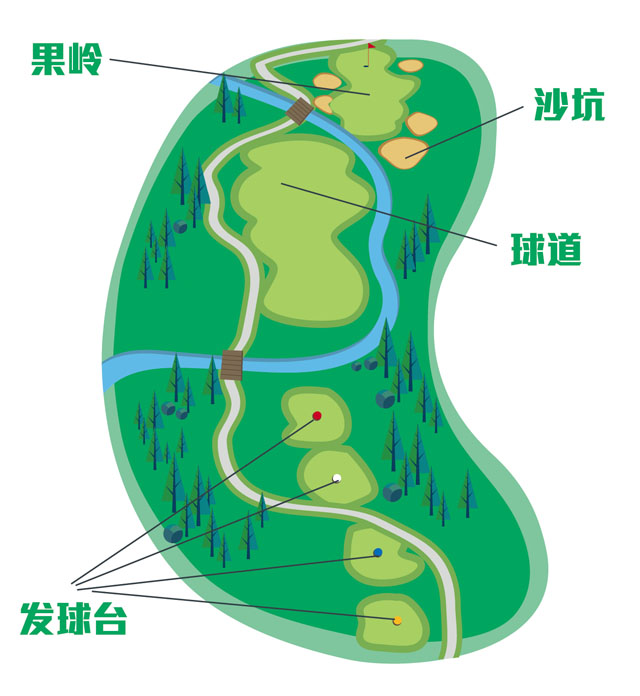 走入球场,根据你的实力,可选择离果岭不同距离的发球台开球。发球台也称Tee台,一般以颜色区分,红色距离最短,通常是女子业余球手专用,白色发球台是一般水平的业余男球手使用,蓝色和黑色分别是给高手和职业选手的,有的球场还有距离比红Tee更短的儿童Tee或比黑Tee更长的金Tee。常由高尔夫球联想到人生,其实这跟生活差不多,要一步一步计划着来,先有第一杆才有第二杆,而打球时一定要心无杂念,一心一意地打好眼前这杆。要一个洞一个洞地攻破绝非易事,洞与洞之间距离一般为90米到540米不等,各球洞之间一般分为开球草坪、开阔草地、地势起伏区或灌木丛、障碍区和球洞草坪。每个球洞周围都有天然的或人工设置的沙坑、草丛、小溪、池塘和灌木丛等各种障碍,如果不小心掉到长草或者沙坑就要花一番心思救球了。