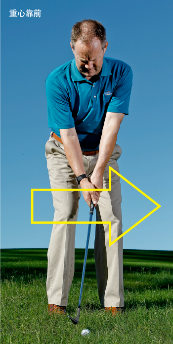 站位,将大约60%的体重置于前脚,球对准站位正中稍偏后方。双手保持对准裤子拉链,使杆身稍微向着目标倾斜。你的双膝应该稍微偏向目标一点儿。