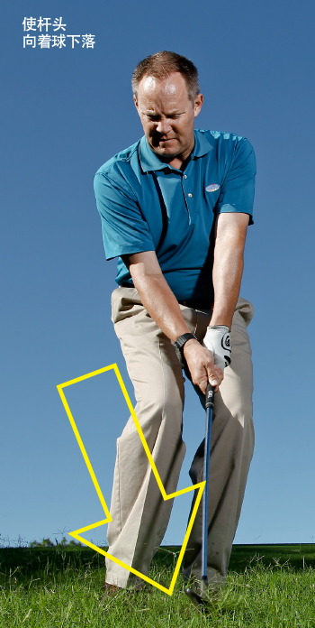其他部位保持不动,想象你的双臂变得非常沉重,让它们带动杆头向着球下落。忘掉顺势动作,让杆头掘进球下方的草皮。球将会接近笔直地高高飞起,柔和地着陆,滚动很少。
