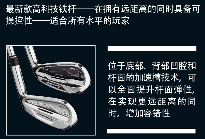 两年前,泰勒梅推出了“加速槽”科技:配备在杆面底部的沟槽设计以改善铁杆杆面击球位置偏低的击球效果。泰勒梅已经把在研发加速槽科技时所获取的经验应用到铁杆的杆面设计中,以激活杆面趾部和跟部区域,从而为整个杆面提供更统一的弯曲回弹力,保证偏离中心位置击球时的球速。