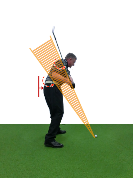 要开始下杆,向后“顶胯”(倾斜胯部)使胯部弯曲,以延迟胯部和肩膀的转动(如图3)。胯部和肩膀转动的延后为双臂和球杆沿正确的内侧路径下挥留出空间和时间(如图3)。