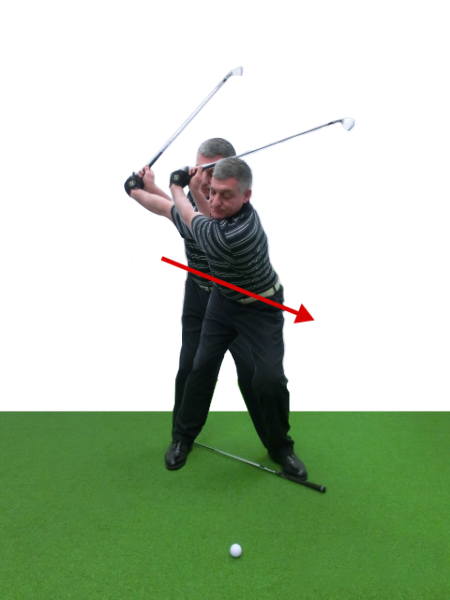 如果球总是右曲或左直,就意味着你总是沿外到内的路径下杆击球的。这种问题表现为在(上下杆)过渡和初始下杆时,胯部提前收直,致使胯部和肩膀的转动过早过快(如图2),造成球杆从正确平面上方被向外抛出(如图2),形成外到内的杆头路径触球。胯部提前收直很常见,但不是每次都有,其和初始下杆时右脚跟过早地突然提起同时产生。