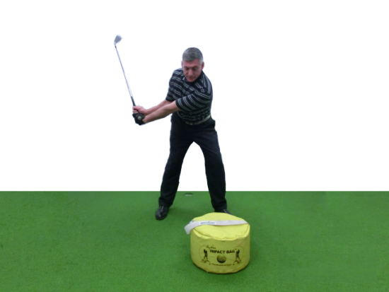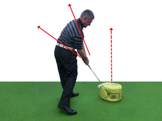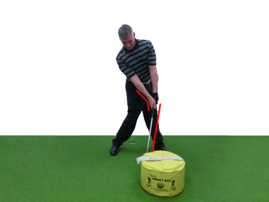 击打包的同时要绝对保持右手腕向后弯曲的状态。这点非常关键,因为可以避免双手和手腕的错误动作,进而导致杆身和左臂夹角的过早释放。