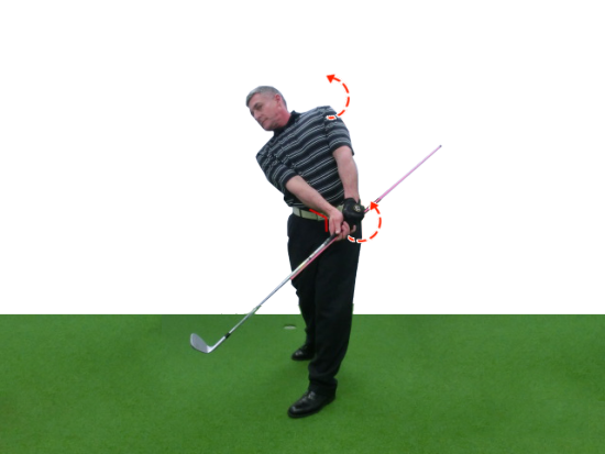 接下来要开始转动身体。“通过身体转动的动作释放”的动态过程为,左胯向后转,同时左臂积极主动地向下“拽”动球杆握把末端。当手到达右侧大腿处时,左肩开始同时向上并向后运动。