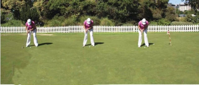 站位再宽一点,上杆至杆头与右脚外侧平齐,重复推击动作,让杆头经过你的左脚。在所有推击中,感觉球从杆面弹出后的滚动,直至入洞。