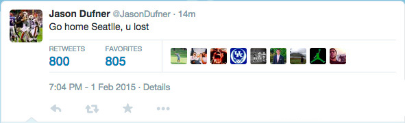 走神帝杰森-杜夫纳是新英格兰爱国者队的忠实粉丝,他在社交网站上调侃说道:“回家吧西雅图,你们输了”,对于主队的支持不言而喻。