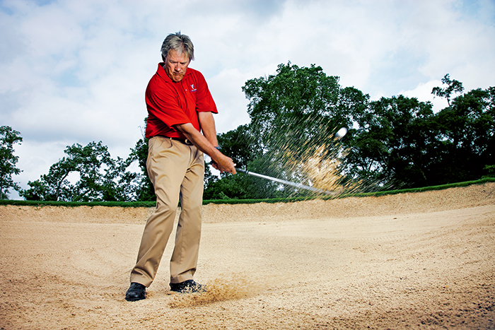 当你感觉杆头触到沙面时,使手腕向着目标翻转,就像你正试图用右手将一小堆沙子掘出沙坑一样。这种手腕动作是开球和球道击球的大忌,但它能够帮助你打起来合适数量的沙子,使球柔和地飞向果岭。