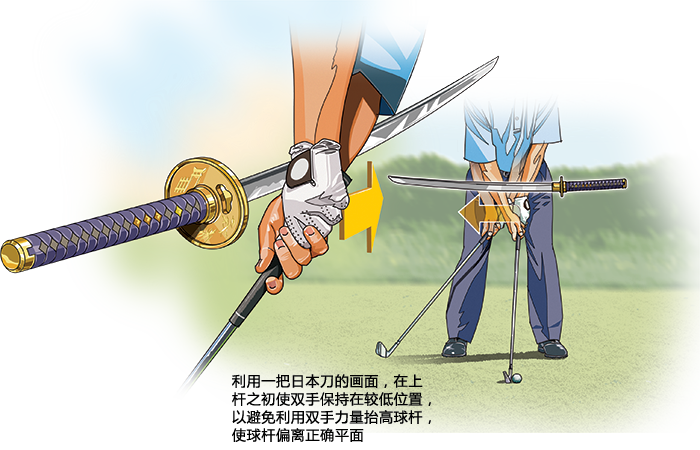 要完善上杆前半程动作,可以想象站位时双腕稍偏上方悬着一把日本刀。如果你不想割破手腕,在上杆前1英尺(0.3米)左右,需要使双手保持在非常低的位置,低于日本刀。争取笔直向后挥动双手,不要抬高它们。做到了这一点,你就能够使杆头保持靠外,处于双手前方,杆面垂直,从而做出有力的挥杆,并使球杆保持在正确平面上。(来源:《高尔夫》杂志)