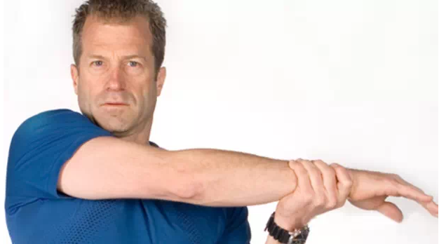 做法:双脚站立与髋同宽,双膝微弯。将左手越过身体,手肘微弯。并以右手固定于左手肘处,然后将左手臂向身体靠,直到感觉到肩膀的肌肉紧绷。换边再重复相同动作。