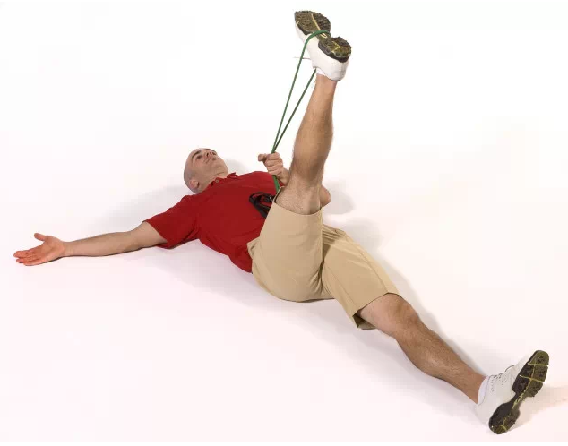 做法:平躺于地面,并伸直双腿。轮流将一脚抬起,并保持膝关节伸直固定,然后将脚趾头朝向身体方向拉。假如柔软度很好,可将大腿拉近身体,增加伸展强度。