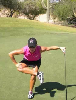 做法:手握球杆,单腿站立,另一条腿脚腕放于支撑腿上,臀部往下往后坐,直到拉伸腿有拉伸感。