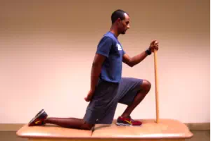 做法:跪姿箭步,手握球杆。后腿膝跪于地面,前腿脚紧贴地面,用膝盖尽量去触碰球杆。