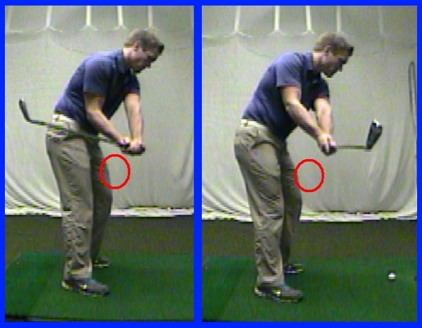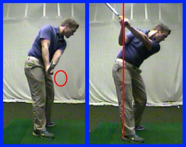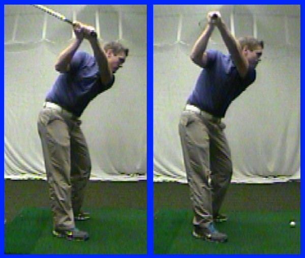 左:在上杆过程中旋转前臂及手腕的情形。右:在众多球友中普遍存在的“直退直上”式上杆