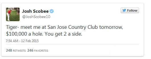 斯科贝在推特写道:“老虎--明天我们约在圣何塞乡村俱乐部,10万一个洞。前后九各让你2洞。”