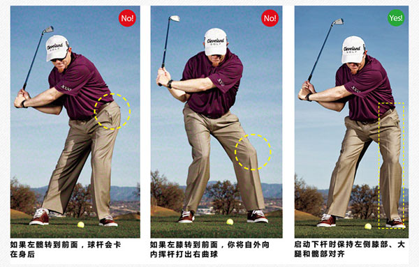 好的下杆动作应自下而上启动——挥杆应该由下半身引导。我打赌你知道这个原理,但落实到球技上它意味着什么?意味着你身体左侧的三个关键部位——髋部、大腿和膝盖——必须同步移动和作用。如果左髋转到前面,双臂会卡在身后并削弱挥杆速度。如果仅用膝盖触发下杆,将形成覆盖式下杆打出右曲球。当左侧(髋部、大腿或膝盖)中的任一部位超前于其他两个,你的击球就会有麻烦。要打出又直又远的击球,下半身的三个部位必须像跳三人舞那样协调一致地移动。