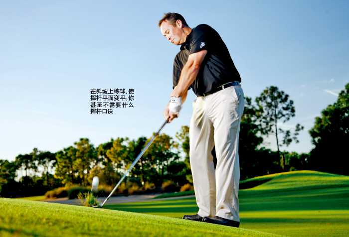 要使挥杆平面变平,找到正确挥杆平面,可以试着在斜坡上练球,使球稍高于双脚。这会迫使你做出更接近于围绕身体的挥杆,并使球杆正确还原。详细做法是:在练习场找一处小斜坡,站在下坡方向,使脚尖高于脚跟一点儿。开始时先做四分之三挥杆,放慢挥杆速度,体会斜坡带来的触球感觉。你会感觉到上杆时球杆的位置变低了,更接近于围绕身体,下杆时也是如此。开始时,如果你经常遇到球杆跟部掘进地面的问题,不要惊讶。要避免这种问题,可以使球杆充分还原(趾部向着跟部上方转动)。很快,你就会发现自己打出的球变直了,甚至会柔和地由右向左弯。(来源:《高尔夫》杂志)