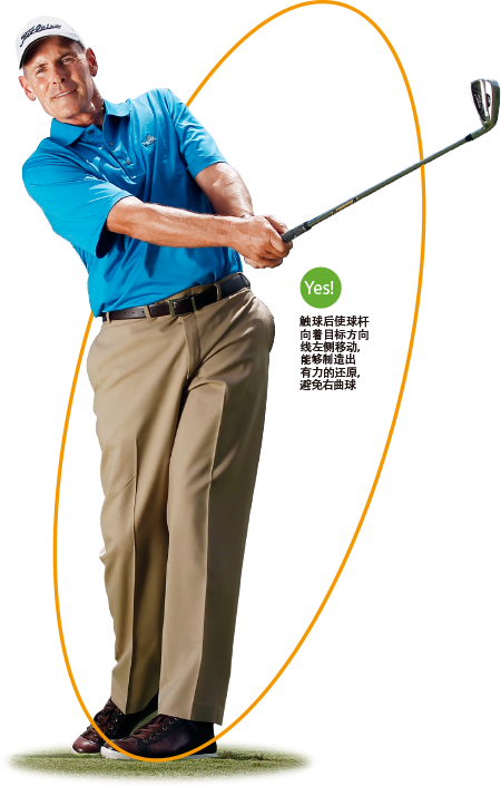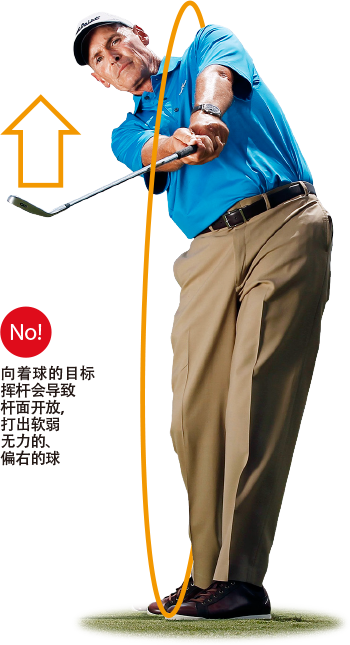 触球后使杆头向着目标移动,这似乎是符合逻辑的。毕竟,那里是你希望球停住的地方。但事实上,这个动作是错误的:在顺势动作中迫使杆头沿着目标方向线移动(见下图)一定会导致右曲球。因为当你使杆头向着目标移动时,触球过程中杆面会保持开放。