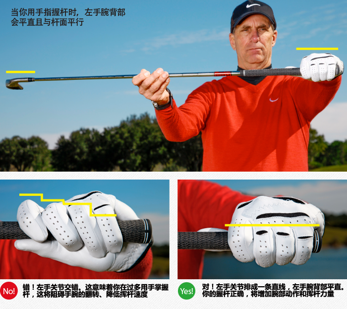 挥杆中起重要作用的左手可以通过两种方式握杆:握在手指里或横过手掌。应选择手指握杆法。用其他部位握杆会限制上杆时的手腕翻转(丧失力量)并在通过触球时难以释放球杆(打出右曲球)。以手指为主的握杆则让翻腕和释放变得容易,从而切实地提升挥杆速度。如何知道左手的握杆是否正确?我的握杆检查法能很快告诉你。