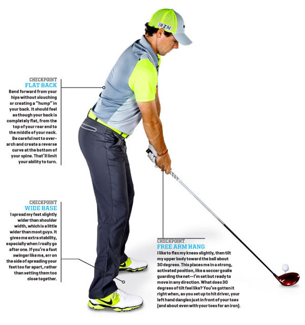 双脚的距离要略宽于双肩,我的幅度会比很多球手宽一点。这样我的站位会更加稳定。如果你像我一样,挥杆速度很快,这样的站位会对自己更有利。