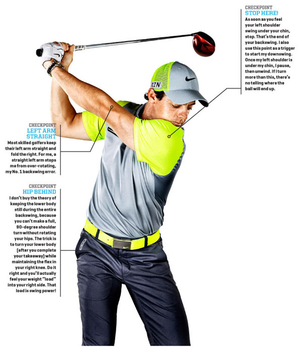 很多理论要求上杆时整个下身都要保持不动,但是我觉得要完全做到这点很难,这意味着臀部在双肩旋转了90度后还要纹丝不动,我是做不到的。我会在弯曲右膝的时候转动臀部。你可以明显的感觉到重心移到了右侧,这就为挥杆蓄积了力量。