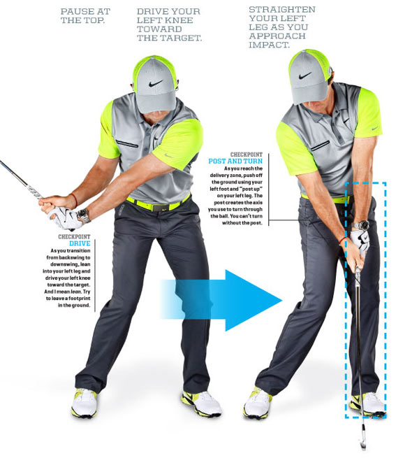 上杆置顶后开始下杆,转动左腿,让左膝指向目标,你要卯足劲,在地上留下一个脚印。