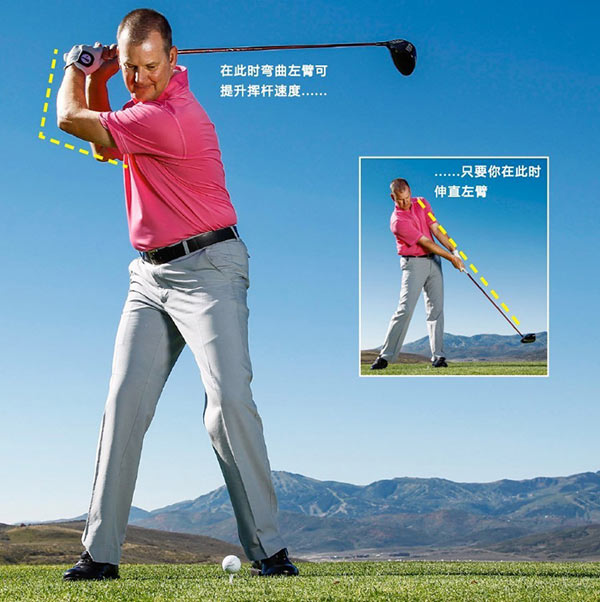 和许多周末业余球员一样,你也会患上“挥杆羡慕症”。看到巴巴·沃森等美巡赛球星,你羡慕他们高举的上杆以及在上杆顶点笔直伸展的前侧手臂。如果能做到,这些产生力量的动作非常棒。但要想保持左臂伸直和双手高抬需要极好的身体柔韧性。明智的做法是在到达上杆顶点时让你的左肘松弛(上面面大图)。为什么?通常初学者的身体柔韧性很差,或许他们本来也会弯曲左肘。其次,弯曲的手臂可以成为一个能量源——虽然它看上去不像标准挥杆那样完美。要想利用这点,你必须在下杆时主动地伸直左臂。这个伸展动作能在接近触球时提升挥杆速度。如果左臂没有伸直你就会错失这次加速的机会,或许还会偏离球道。所以不要试图模仿巴巴。你的左臂在上杆顶点什么样并不重要。只要确保左臂在触球时伸直,以便形成纯粹、有力的击打。让别的球员也开始羡慕你吧。