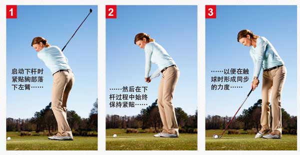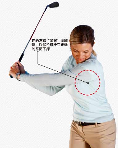 保持左上臂紧贴左侧胸部——没有比这更简单、更有效的挥杆秘诀了。就像一个魔法,让这种紧贴与身体转动和手臂挥舞保持同步,就能让挥杆处于正确的平面,同时在整个上杆过程中维持杆面端正。下杆时确保维持这种紧贴,这将有助于在正确的平面上挥杆,并让你利用身体的转动——不只是双臂动作——在触球时产生力度。