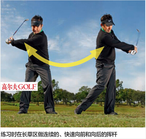 热身后拿一支铁杆,找一处长草区,然后尽你所能快速用力地挥杆,向前向后、反反复复。每次都打起一些草皮,每次都用力挥。挥到第4次时,你会刨出一条小沟,就是球位的所在。挥到第10次,你会感到疲劳。在12次的高速击打之后停止。现在放一个球并击打它。你将发现挥杆比平常快,击球的距离至少远一号球杆。
