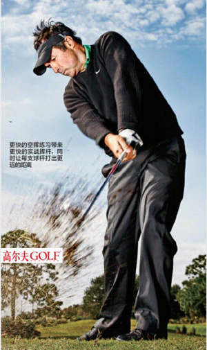 如何发生的?快速前后挥杆给你的动作带来很多好处。首先,它使你处于更动感的体能状态。与球场上的静态位置起步不同,你在不停地移动,所以挥杆更有运动性。其次,这让上杆到下杆的过渡动作更像是快速的“转折”,而不只是……过渡。这个加速的方向转变可加快触球时的速度。最后,它还让你体会到真正的速度是什么。你的挥杆速度比你想象的更有潜力;你只是从没强迫自己去挖掘它。所以要强迫自己!练习中越适应快速挥杆,下场时越有可能做到。