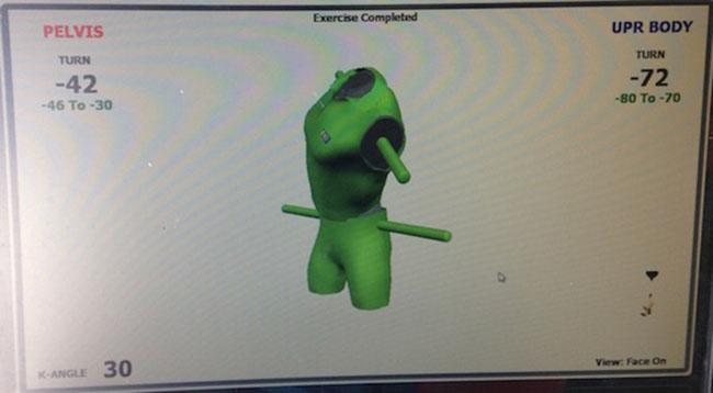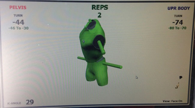 下面将举例说明(见图7)。Nick的盆骨及胸腔部位采取了K-Vest所建议的旋转度数,如图8所示(绿色数字表示动作规范)。姿势看上去相当稳实。关键部位的动态旋转情况非常良好。