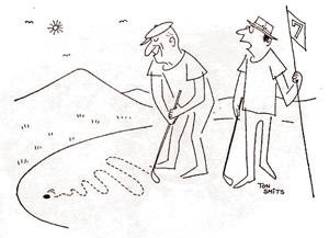 佩特第一次去球场打球。教练告诉他,“先将球放在球座上,然后击球,尽可能把球打到离球洞近的地方,越近越好。”佩特挥杆出去,球离球洞的距离只有两英寸远。他们走上果岭,教练又说,“现在你轻轻把球击入洞就可以了。”佩特十分不解地问道,“你刚才为什么不让我把球直接击入洞呢?”