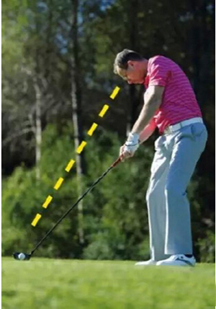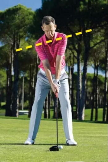 准备击球时,脊柱要朝离目标方向相反的方向弯曲,使右肩比左肩低。你需要一个很稳定的挥杆姿势帮你在整个挥杆过程中保持平衡。准备击球时,身体重心有55%置于身体右侧(对右撇子球手来说)。击球姿势应该要提前准备好。注意图中球手的肩膀倾斜位置,以及接下来在击球时身体的位置变化。