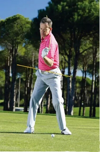 如果上杆的动作不正确,是不可能提高击球准确度以及小白球的飞行距离的。图中显示了上杆时正确的肩部动作,即肩部要有90°的转动,这时双髋只转动45°。如图中,用一根调整棒放在身体正面系腰带的位置,另一根放在肩膀处,这样在挥杆时球手就能感受到身体的确切转动。