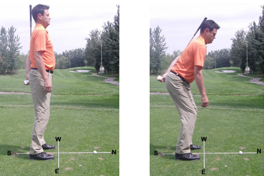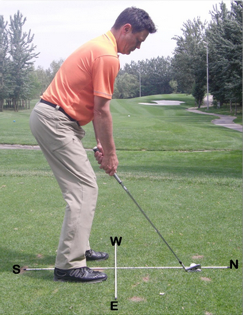 想象一下,如上图所示,面向北方直立,杆身紧靠脊柱。当上半身开始前倾时,也就是向北倾斜,尾骨应该是稍稍指向南方。继续前倾,直到双臂可以自然下垂、握杆、并且不会碰到大腿内侧,这时就不需再继续前倾。恰当的球位应该是位于南北方向上较容易形成陡直击球角度上的某一点。