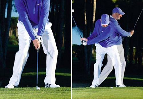 假设你不是一个非常擅长切球的球员,并且每当你站在果岭边准备切球时都会感到紧张和不安,担心你的切球太薄打穿果岭或者切球太厚直接打地。那么切滚球看起来更加适合你。用一支七号铁并且采取你用推杆的握杆姿势。采用推杆的站姿,杆面正对旗杆,轻轻转动你的双肩。这样的击球有20%的距离是飞行,80%的距离会在地上滚动。