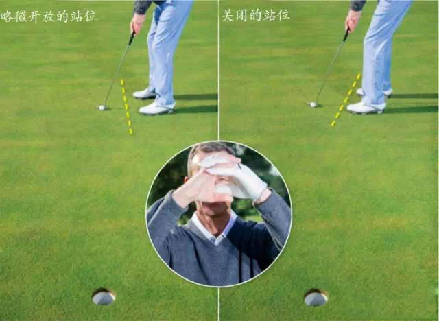 如果你的右眼是主导眼,你应该采取与目标线平行的站姿。无论哪只眼睛是主导眼,都不应该出现关闭式的站姿。如果你像上图右边一样采取关闭式的站位,让你的双脚指向洞杯的右边,你将很难用正直的杆面将球推出去。