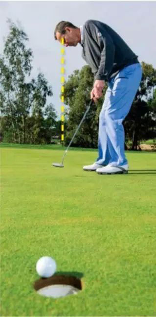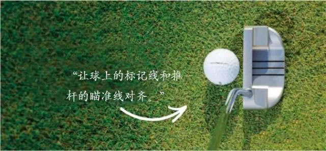 用球上面的记号线对准球杆上的瞄准线,这可以帮助你用推杆的中心将球推出。在每次推杆之前注意这点,可以帮助你让球沿着预想的线路滚动。
