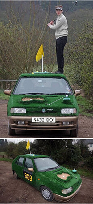 22岁的约翰-麦克阿瑟在自己爱车上铺满了假草,在车顶插上果岭旗,在发动机盖上铺个沙坑,一个迷你高尔夫球场就这样诞生了。球疯子们,很酷吧,但突然开始担心你们家的车了~~