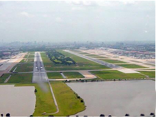 泰国的DonMueang国际机场从远看与其它机场没有太大区别,但是当你走进,你会看到在两条飞机跑道的中间夹着一个18洞的高尔夫球场。看到了吗?这两条跑道的中间有一个高尔夫球场。着实为飞机的安全感到担心!