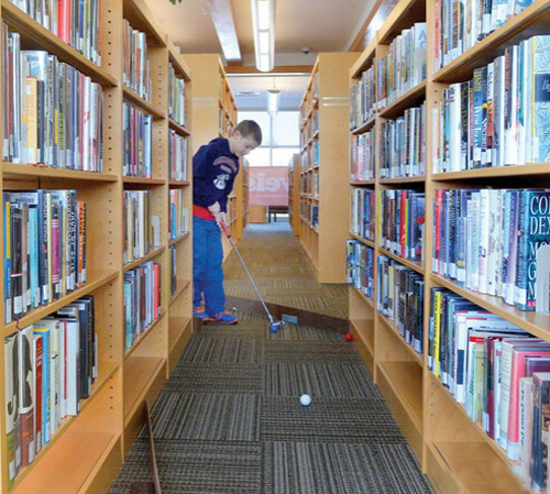 同样地,美国格雷斯雷克免费公共图书馆(Grayslake Area Public Library)在3月9日也把图书馆“改造”成一个迷你球场,并邀请不少家庭来参加活动。打得好的儿童,可以获得免费的冰激凌。通过举办迷你高尔夫活 动,图书馆筹集了大约6000美元,这些钱将为儿童电脑中心购买iPad和Kindle。
