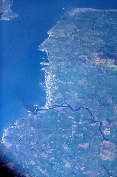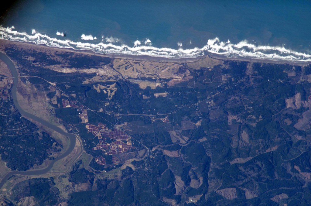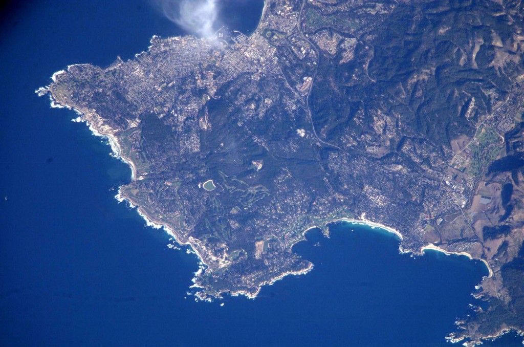 蒙特利半岛。 圆石滩位于图片中部右侧。Cypress Point 以及Spyglass Hill分布于北部沿岸。