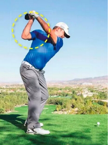 右肘向身体收拢,保持挥杆平面,防止双手过早释放。