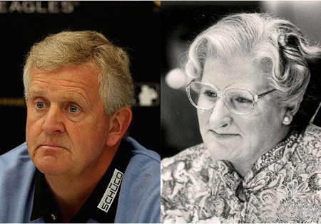 苏格兰球员蒙哥马利自不必说,但是把他跟一个女性比你们是不是有点心塞?可问题是,图片右边那位是男人啊!这是美国著名喜剧电影导演、演员威廉姆斯在1993年拍摄的《窈窕奶爸》时男扮女装的扮相…