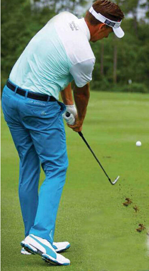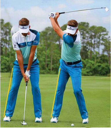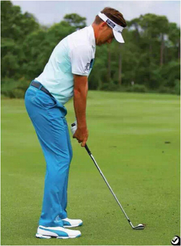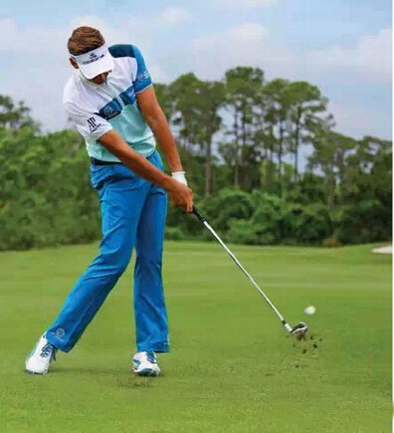 稳定的姿势对良好的挥杆极为重要。腿部不够稳定时,就必须要尽量转移重心到右侧,打球节奏也会受到影响,而球也可能往左飞或者往右飞。在挥杆发挥很好时,腿部的力量肯定是很稳固的。主要是用下半身的力量支撑双肩的转动。