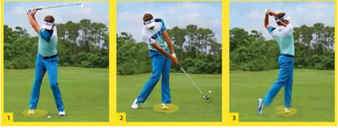 在起杆时,重心应该转移到右侧(如图1)。接着从起杆到送杆的过程中,重心向身体左侧转移(如图2),直至将球击出(如图3)。这个转移的过程是身体轻微的移动,而不是髋部或者上身的大幅度摆动。很多人会把挥杆复杂化,其实,技巧是比较简单的。