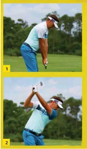 这个部分的练习是我的最爱。像平常一样准备好打球姿势。转动手腕使杆身与地面平行,并与目标线垂直。然后仅转动上半身上杆至顶点。在上身移动时要克服髋部和膝盖随着上身转动的倾向。